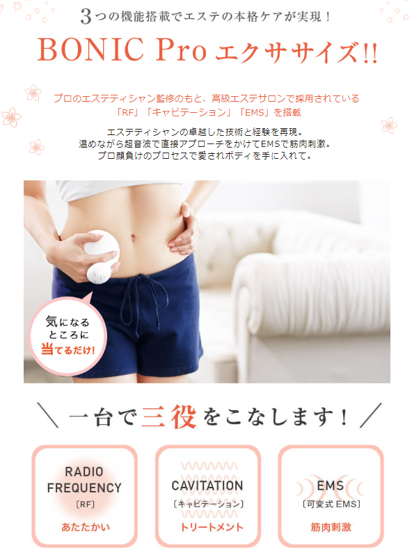 ボニックProは人気インフルエンサーも愛用しておりおうちでエステの「キャビテーション」「RF」「EMS」が簡単にできるボディメイクマシーンです。
